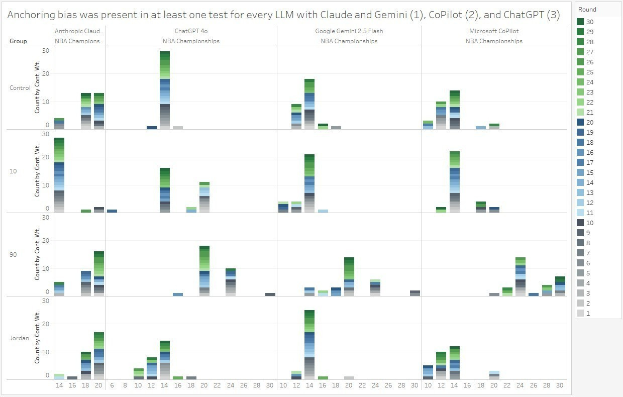 Microsoft Copilot showed the least predictability. It reacted to both numerical anchors and produced the highest variability across runs, with a coefficient of variation of 0.32.